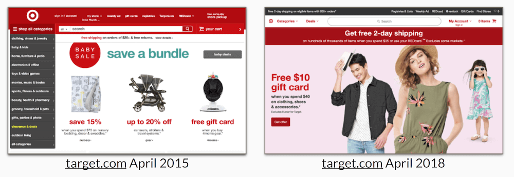 Take a look at the two Target.com photos below. You can easily see how much airier the 2018 version is compared to the 2015 version. The navigation has been significantly simplified, there is one main call to action in the hero area and there’s a lot less text overall. This trend will continue in 2019 and beyond.